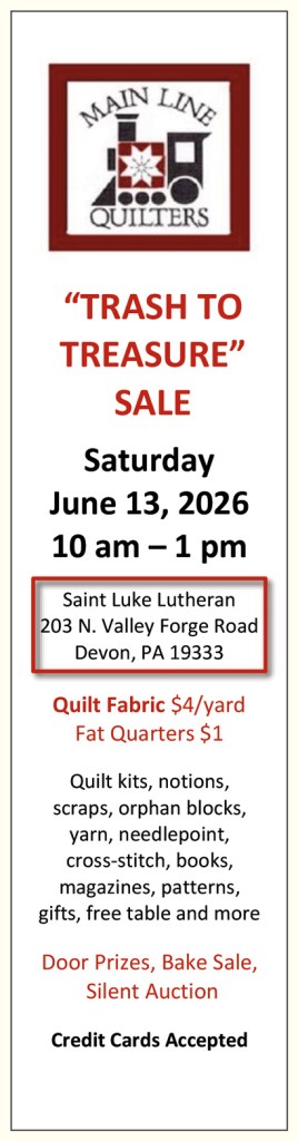 - Snow Policy: Main Line Quilters will not meet if Tredyffrin/Easttown Schools #854 are closed
