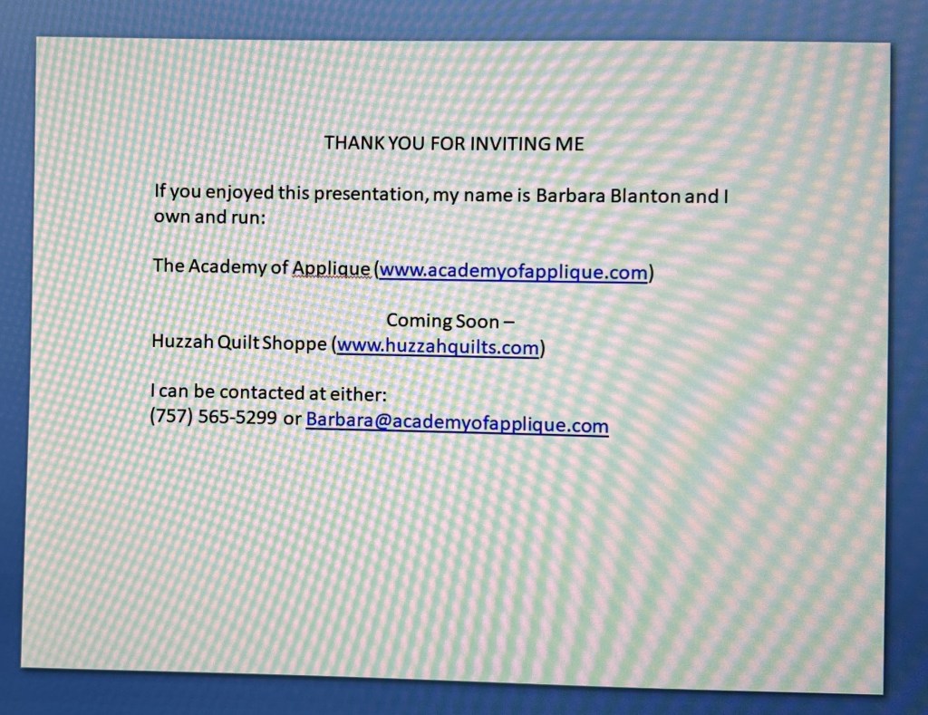 November 15, 2024 – Barbara Blanton Barbara Blanton – Trunk Show Barbara Blanton – Applique Process MLQ Member Show and Tell Share this: Click to share on X (Opens in new window) X Click to share on Facebook (Opens in new window) Facebook Like Loading... Related
