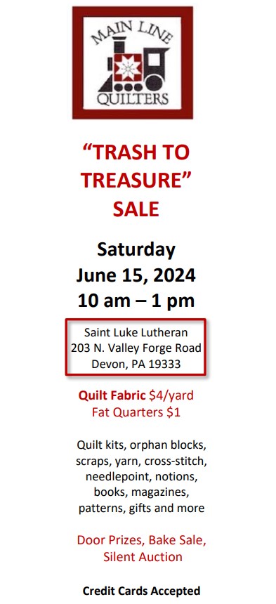 - Also note that we meet in person at the Tredyffrin Library for our Bee (“Sew What”) — a totally separate meeting — on the first Friday of each month, all year long.